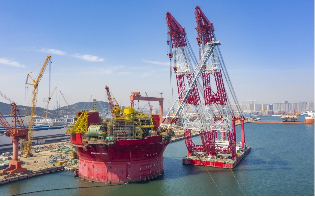 Project introduction:?The Penguins FPSO project is the first cylindrical FPSO construction project undertaken by COOEC. The project, located in the North Sea, UK, is 160km?away from the coastline with 165m water depth. With 3*4 multi-point mooring systems employed, the FPSO units of this project are designed according to the concept of SEVAN 400 cylindrical FPSO with a design life of 20 years and a total weight of about 31,000 tons, among which the total weight of the hull is about 17,000 tons and the total weight of the topside is about 14,000 tons.