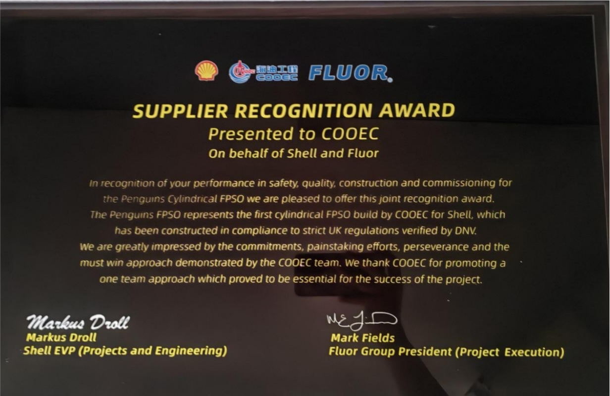 Project highlights:?The project is characterized by high degree of integration, limited working space, stringent safety requirements, great difficulty in construction, complex process, multiple technical difficulties and challenges and Shell’s stringent inspection/acceptance criteria. The FPSO units are requested to be constructed as per highly stringent standards so that they do not need “docking in 20 years”. COOEC managed to complete the lifting of 18 modules in only 27 days, which was an excellent performance in the lifting of integrated modules highly recognized by?SHELL.